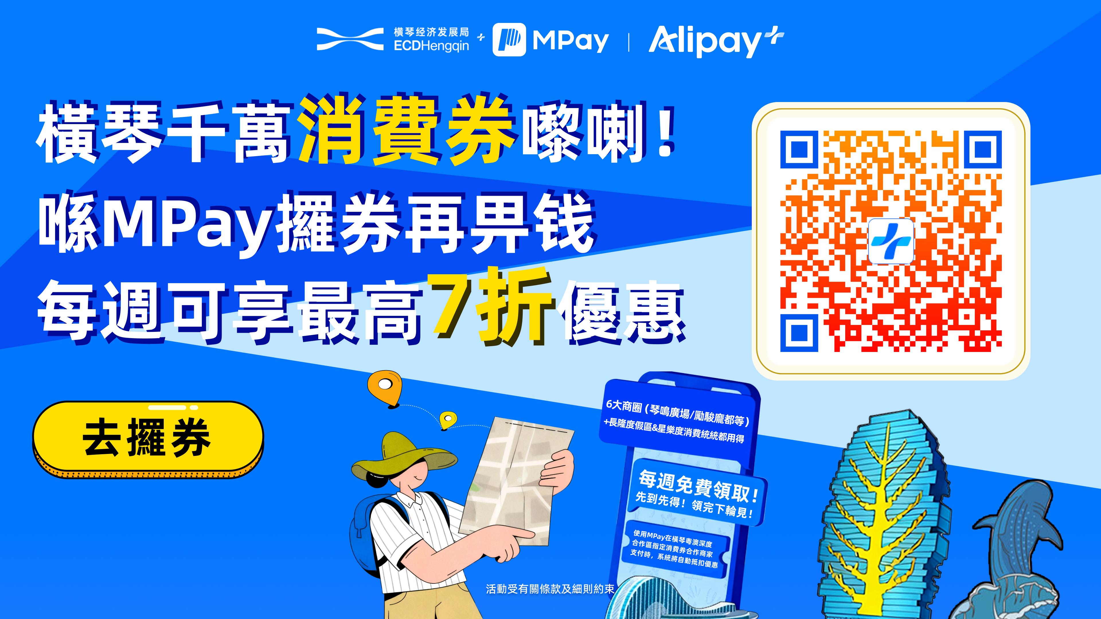 用戶只需打開MPay應用,進入首頁「跨境專區」或點擊活動宣傳頁面即可領券,領取後當周有效。在橫琴消費時,打開MPay付款碼,選擇「澳門境外 via 支 | Alipay+」藍色界面,並選擇「中國內地」,可直接抵扣使用。消費券適用于橫琴全域線下指定商戶,涵蓋橫琴口岸琴鳴廣場、創新方、橫琴華發商都、中央匯(金源國際廣場)、澳門新街坊等六大核心商圈,以及橫琴長隆度假區與星樂度兩大熱門景點,實現了從高端購物到特色餐飲,從主題樂園到休閒度假的全方位覆蓋。