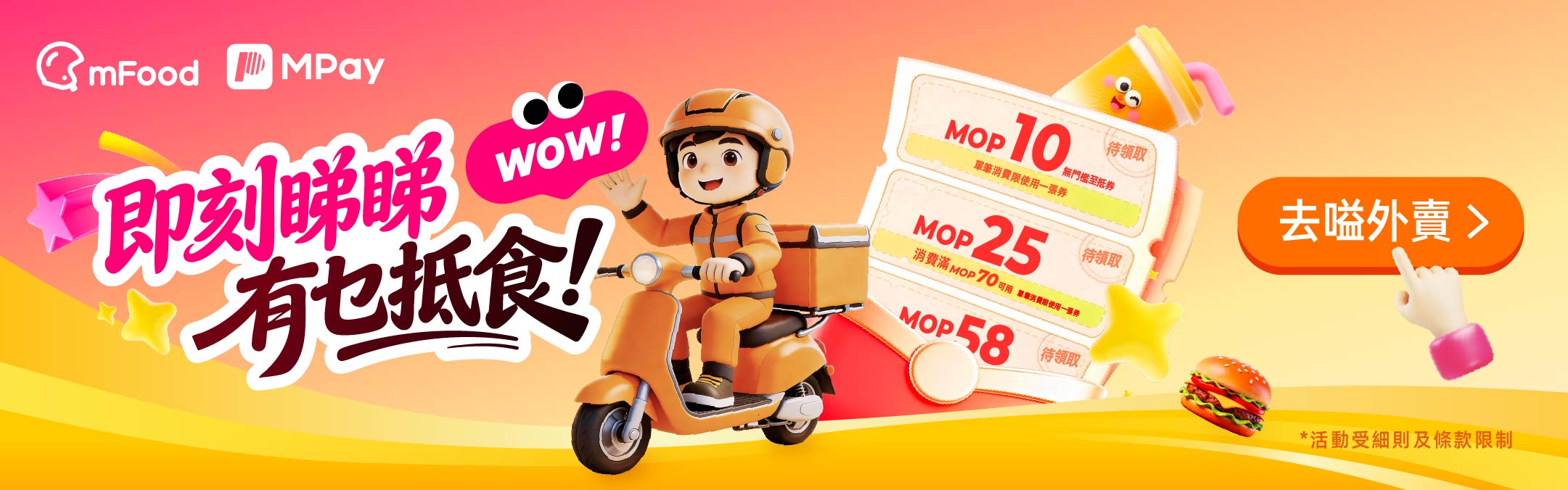 🎁2026年3月2日至5月31日,mFood MOP10無門檻利是每日喺MPay限量派送!🧧仲有MOP70減25、MOP158-58大額利是等你攞!