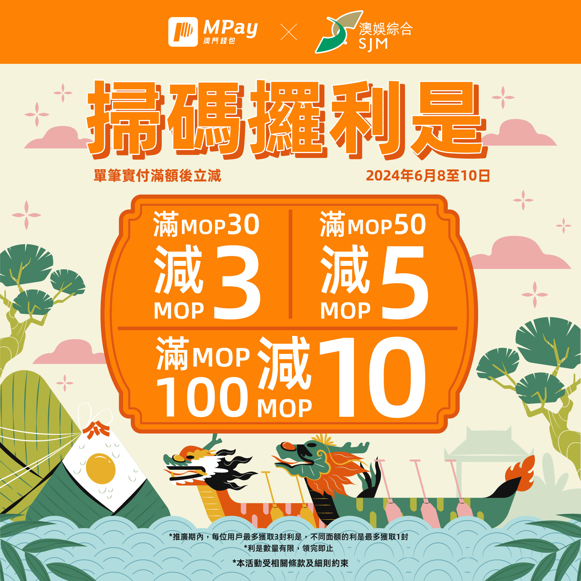 5.1. 於推廣期內,參加者憑MPay澳門錢包(下稱《MPay》)可於參與商戶使用『掃一掃』功能,掃描活動二維碼進入活動頁面,即可領取滿MOP100減MOP10的利是。