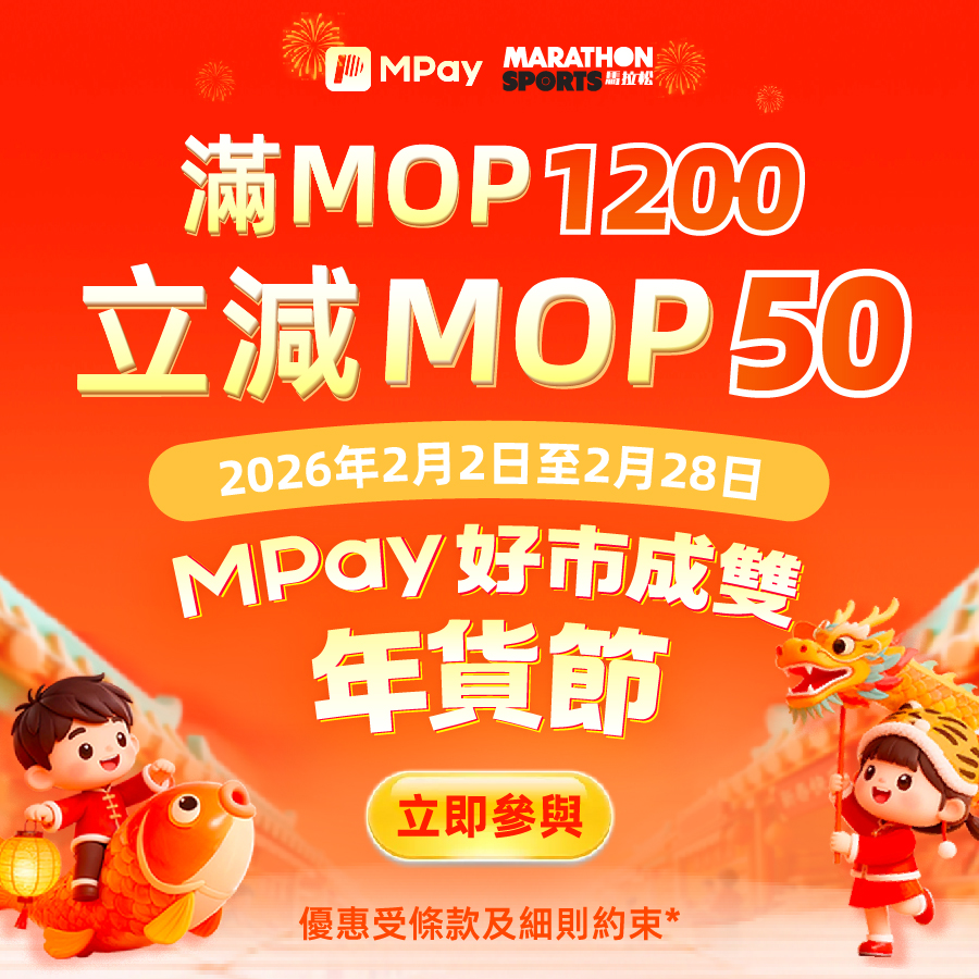 MPay用戶掃碼攞利是後,於商戶全數以MPay支付,單筆實付消費滿MOP1200最高立減MOP50!