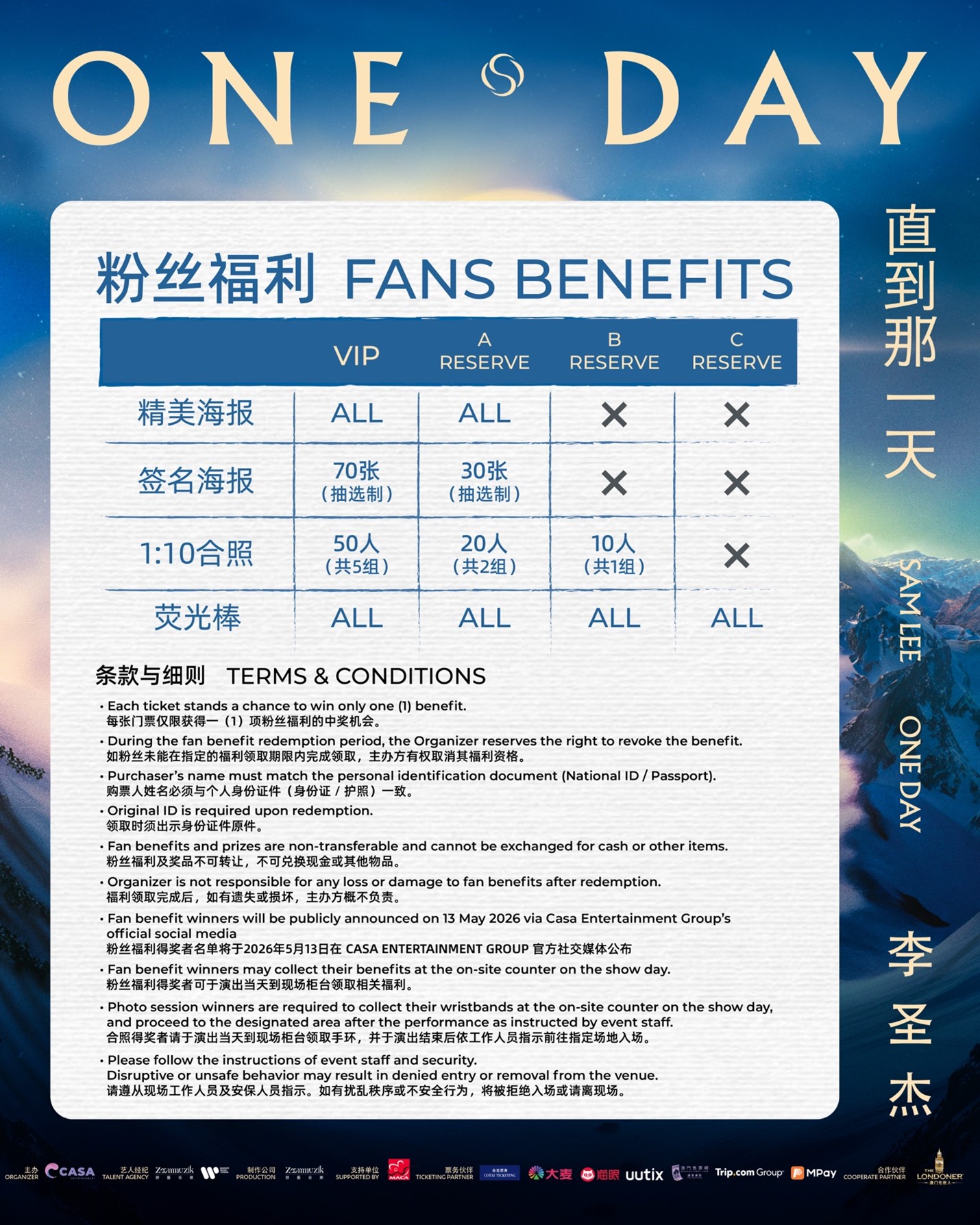 華語樂壇情歌王李聖傑,帶著無數刻進你我青春裡的 BGM,即將登陸澳門倫敦人!從《手放開》的成全放手,到《癡心絕對》的刻骨銘心;從《妳那麼愛她》的動人掙扎,到《眼底星空》的溫柔守候。這些旋律陪伴我們哭過、笑過,也愛過。2026 年,讓我們在澳門的夜空下,共同迎來這個屬於所有歌迷的 One Day。