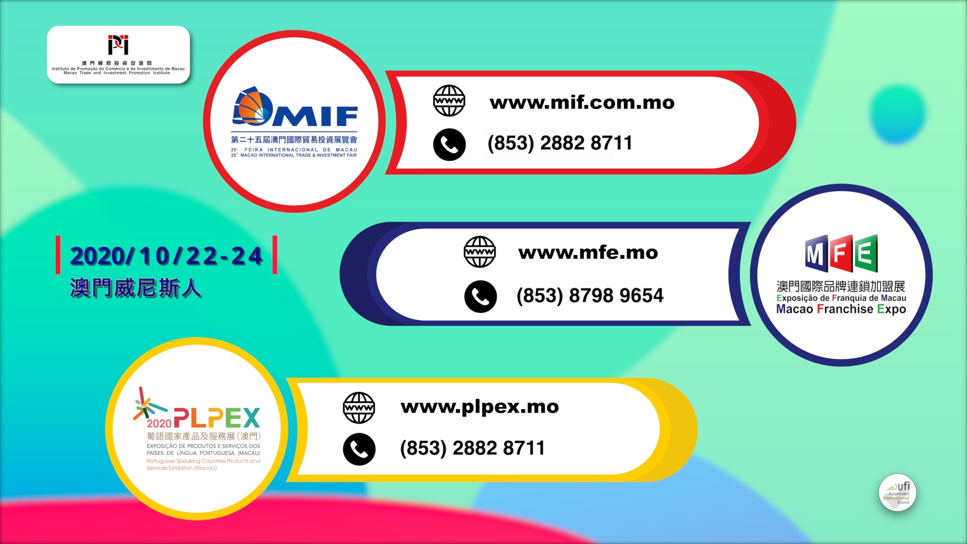 由澳門貿易投資促進局主辦的“第二十五屆澳門國際貿易投資展覽會”(第25屆MIF)、“澳門國際品牌連鎖加盟展2020”(2020MFE)及“2020年葡語國家產品及服務展(澳門)”(2020PLPEX)將於10月22日至24日假澳門威尼斯人舉行。